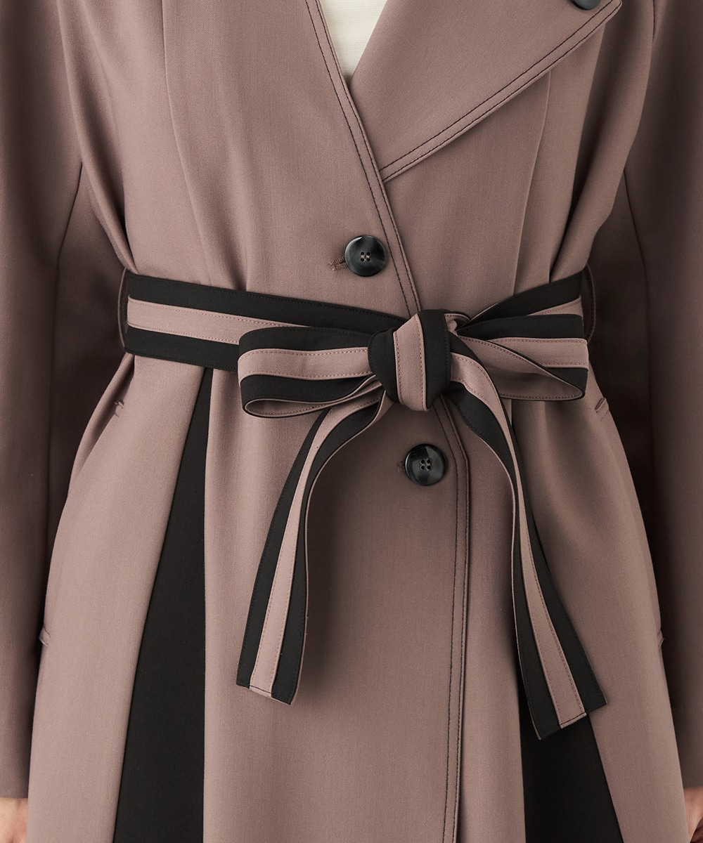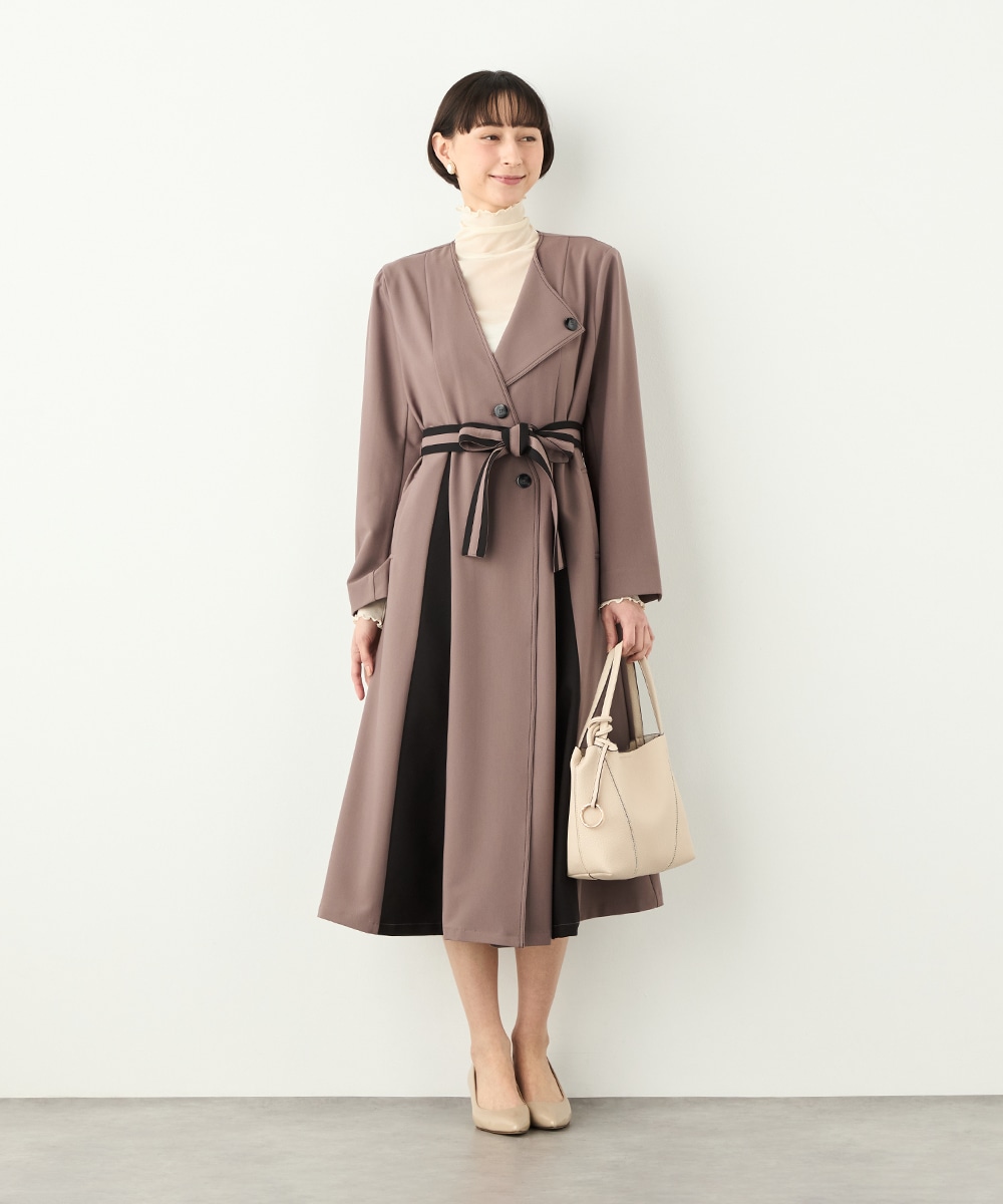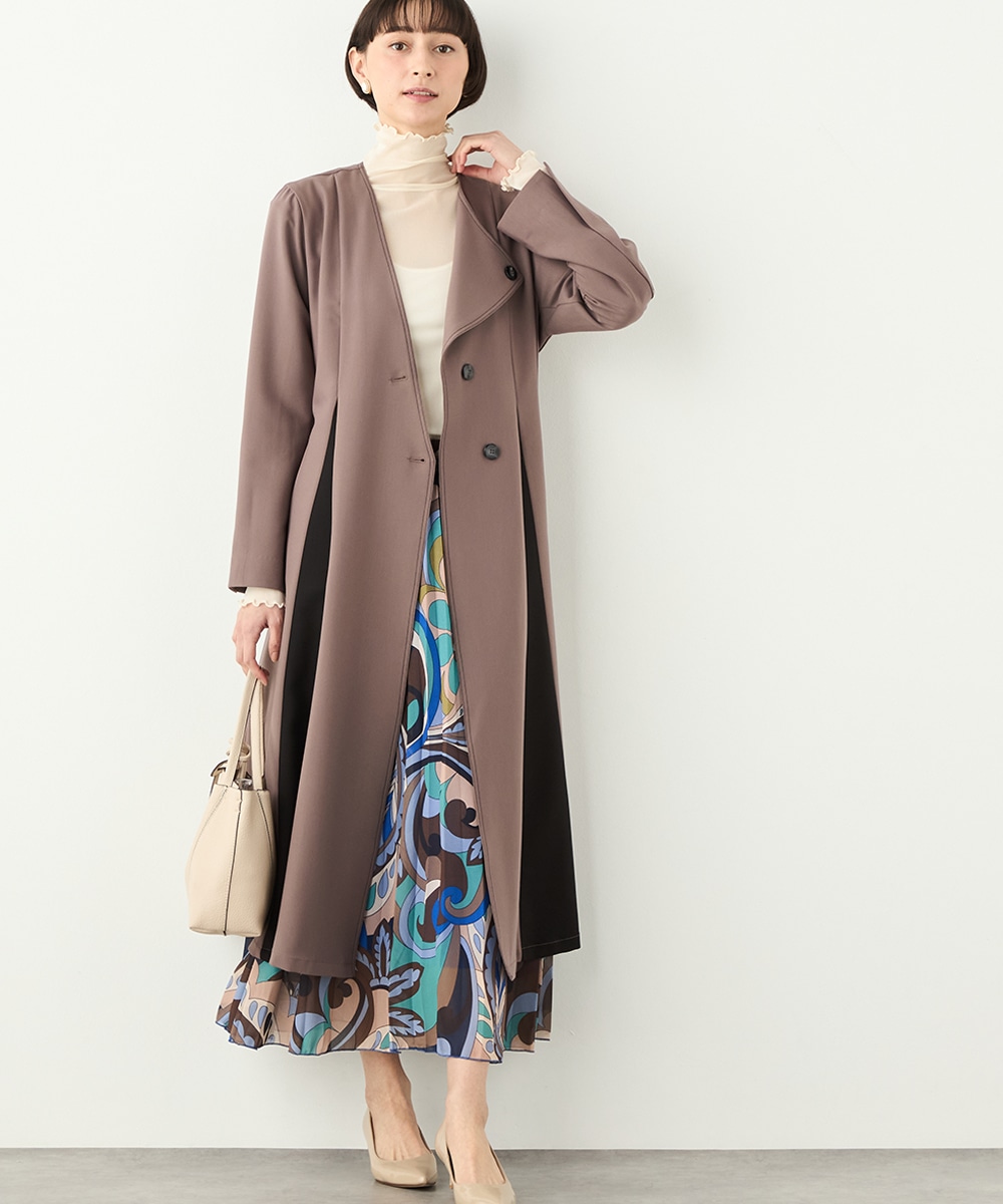 プリーツ風の配色切り替えがポイント。アシンメトリーなデザインもおしゃれなコート。