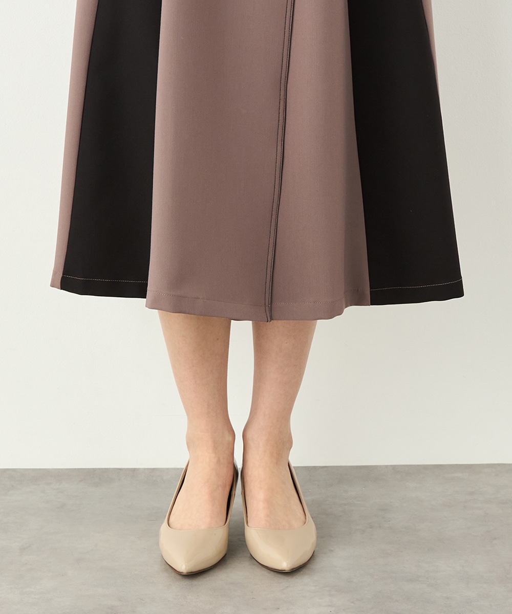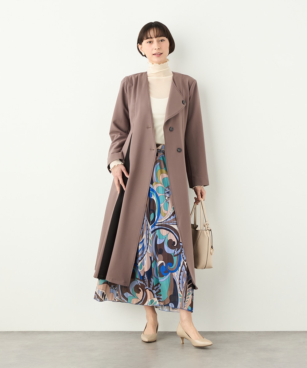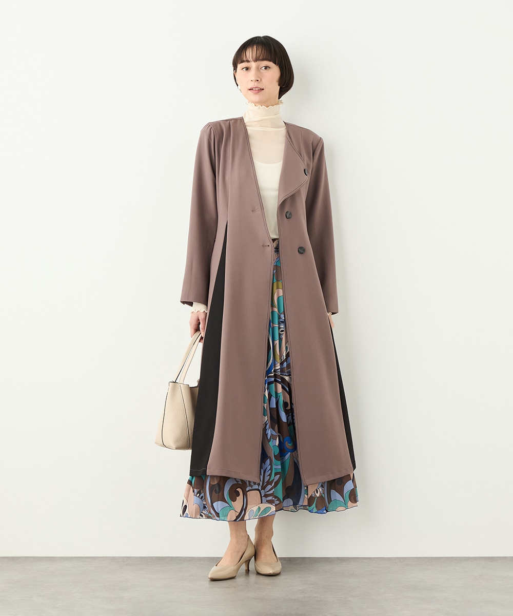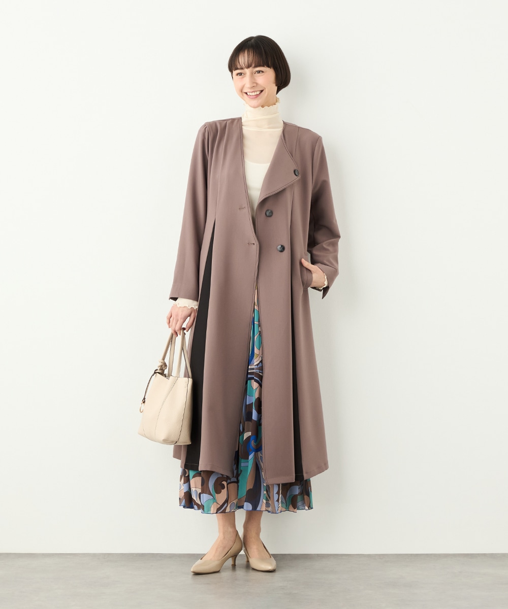プリーツ風の配色切り替えがポイント。アシンメトリーなデザインもおしゃれなコート。