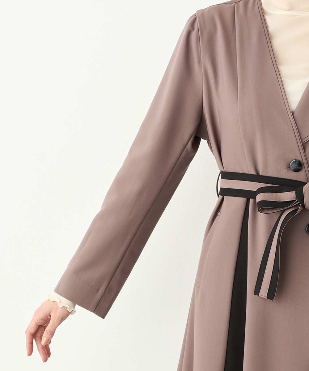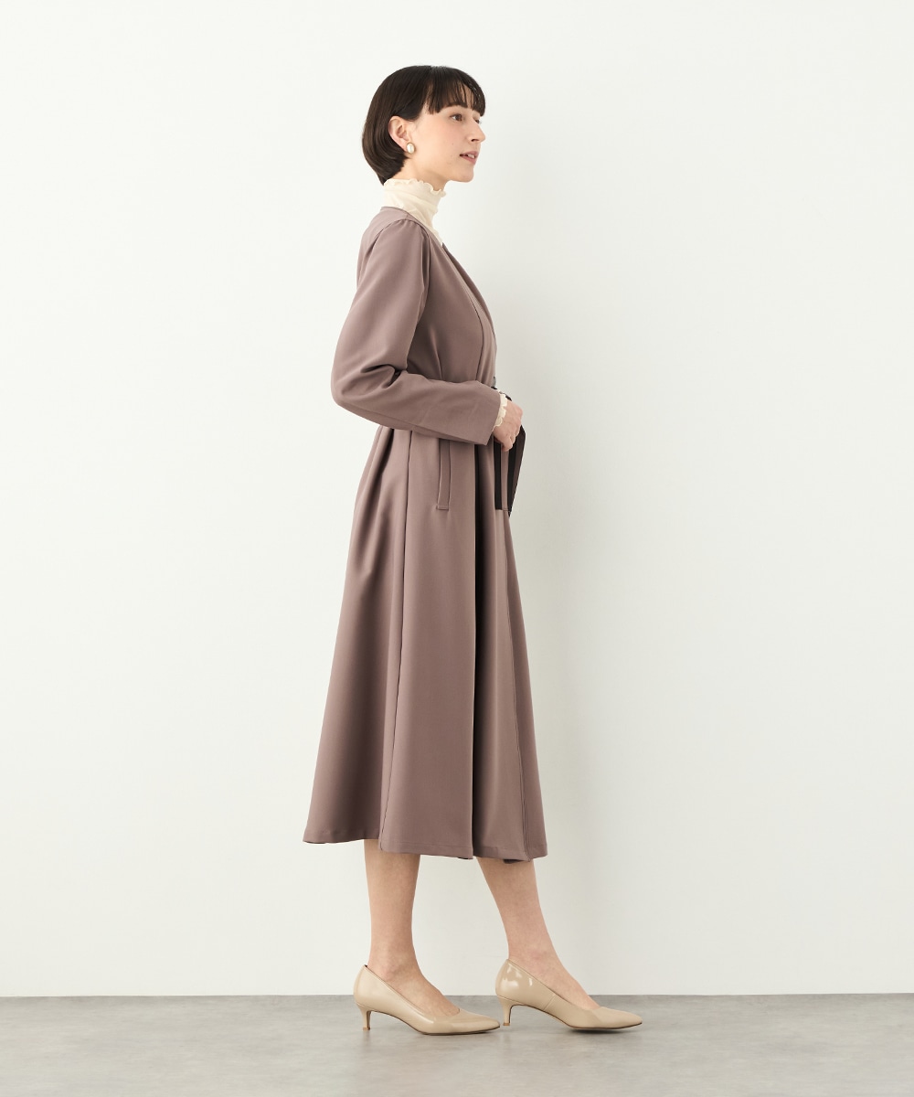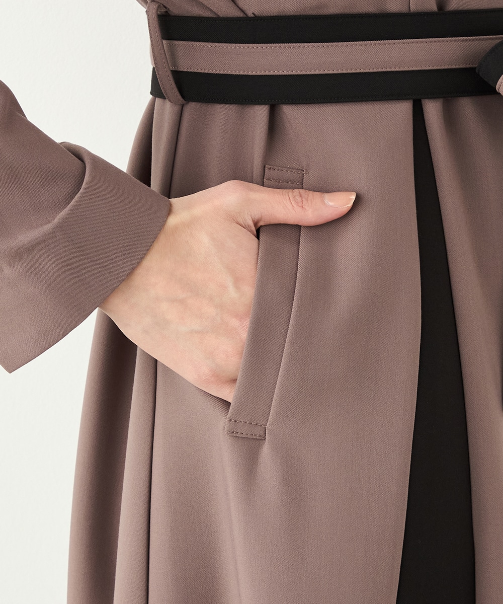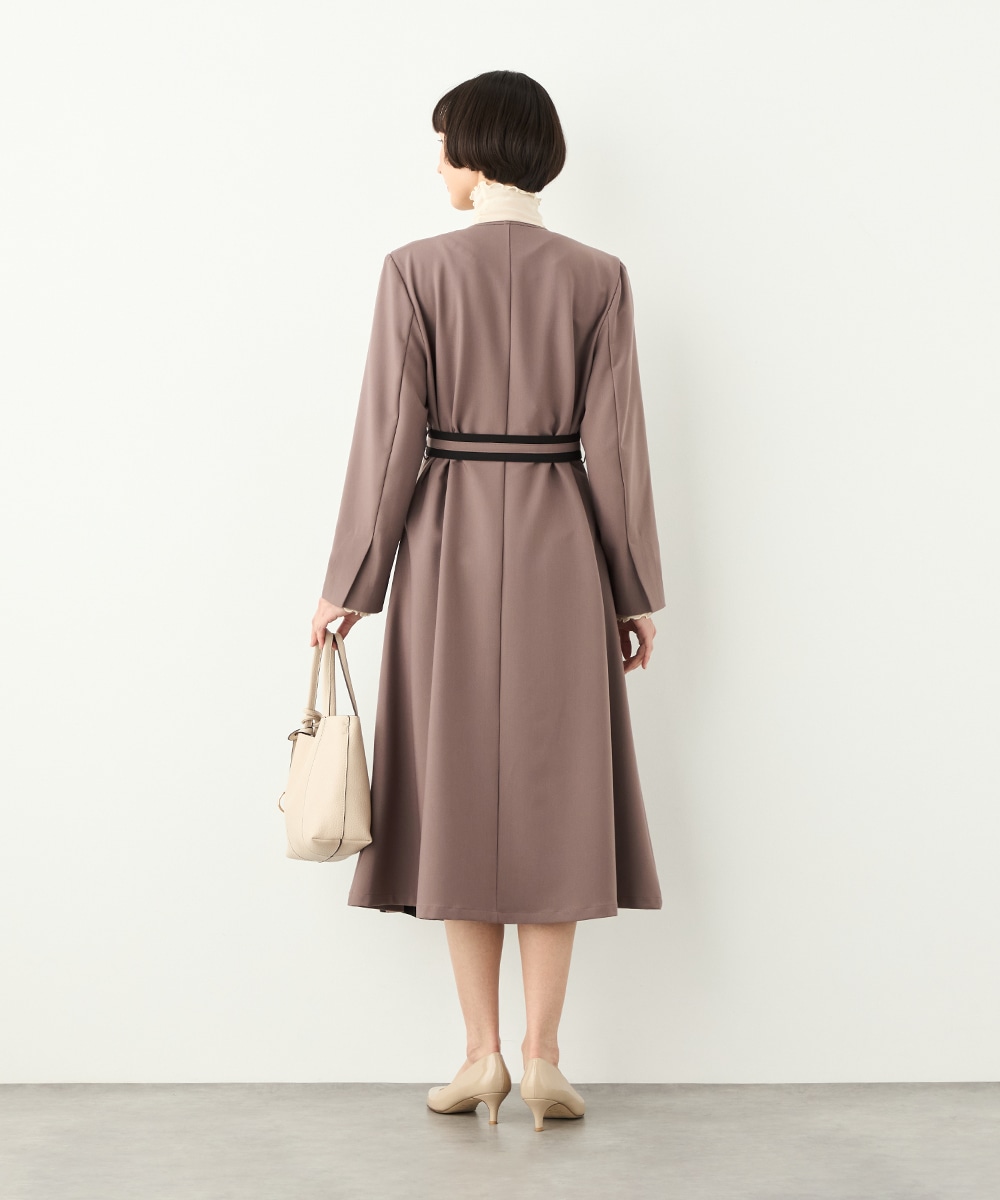 裾に向かってほどよいフレア感を見せる、フェミニンで美しいシルエットです。しなやかな風合いの生地を使用しており、揺れ感やドレープもきれいに現れます。大人っぽくシックに着こなせる長めの着丈を採用。リボンベルトが付属して、ウエストマークのアレンジも楽しめます。